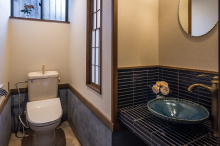 店内奥のトイレへの通路は、茶室の「火灯口(かとうぐち)」をイメージしたアーチ開口に設計。