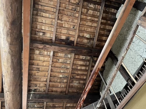 強い日差しのなか、大屋根(2階上)の葺き替え工事が行われました。