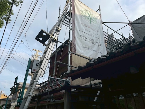 吟優舎の建築幕を掲げた現場