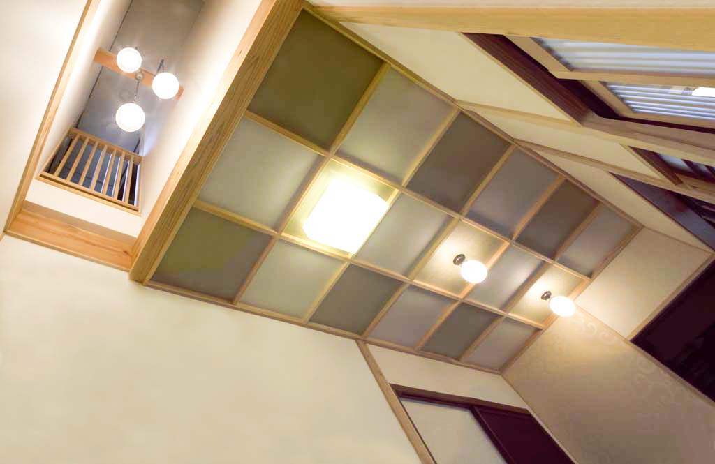 屋根の梁が見える吹き抜け空間を造り、京唐紙の大きなパネルで演出しました。