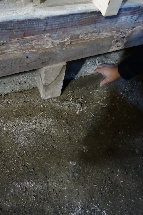 詳しく見てみると、地面に直接柱が設置されているような箇所も多く、シロアリが侵入しやすい環境であったことが分かりました。