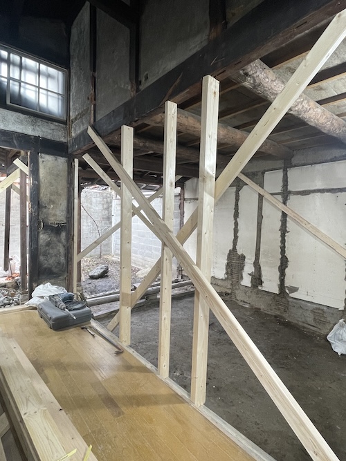 状況を確認後、すぐに支えとなる筋交いを入れ、応急補強を施しました。