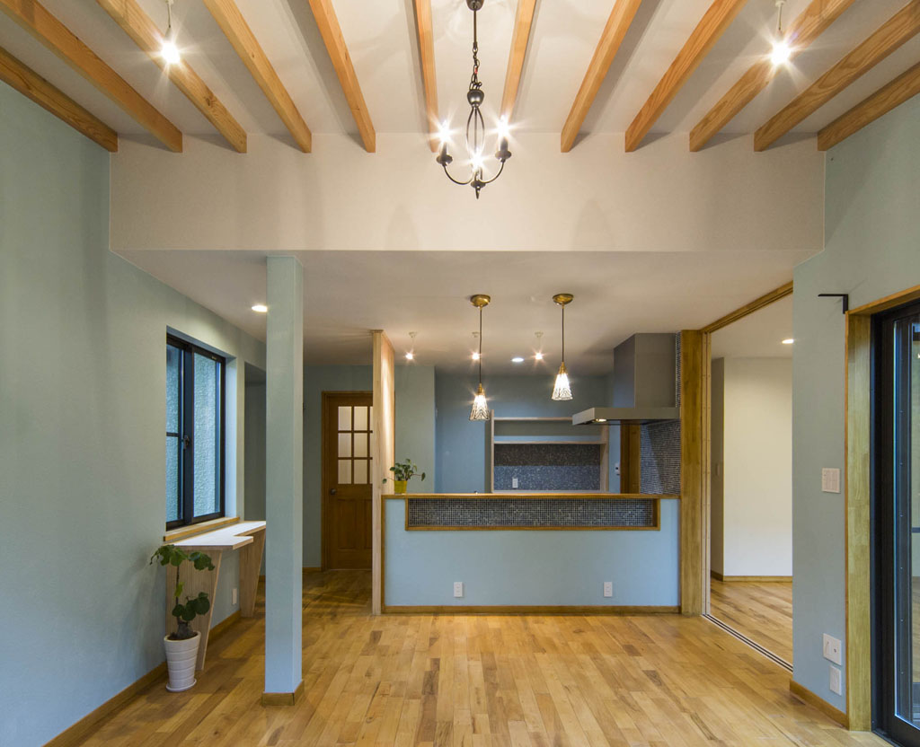 吹き抜けにすることで、大きな梁や柱、勾配の屋根裏が見え、