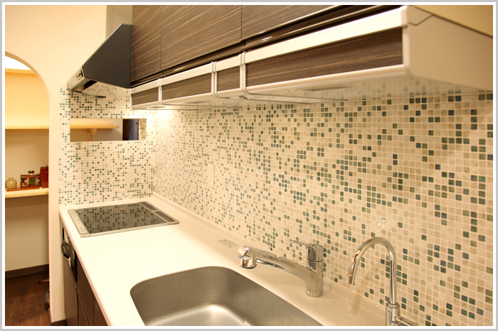 キッチンの壁は、キッチンパネルでなく、モザイクタイルを採用。