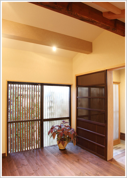 腐食し、朽ちかけた花台と木板、雨戸を撤去し、この家本来の持つ美しい形を引き出すお化粧を施します。