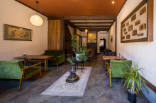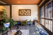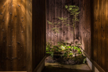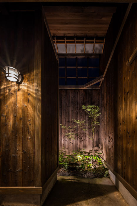 奥には小さな坪庭があり、ほっと一息つける空間になっています。昔ながらのガラスを建具に再利用し、往時の面影を今に伝える趣ある通路です。