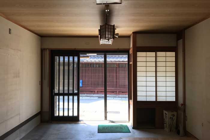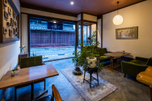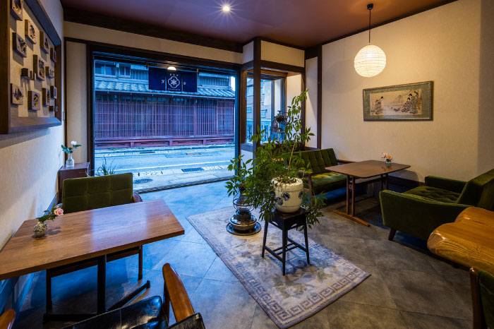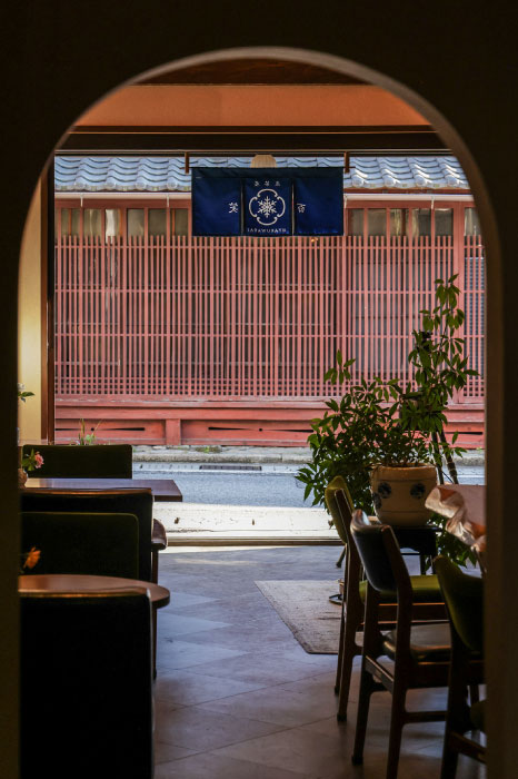 客席から入口を望むと、向かいの町家格子が額縁に切り取られたように映り、静かな情緒を添えています。