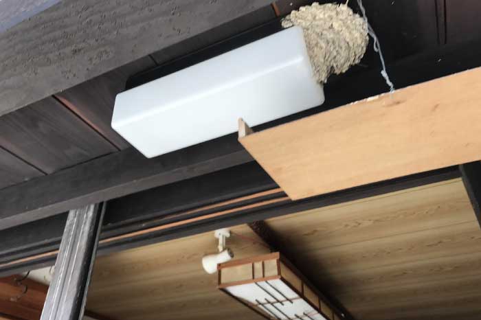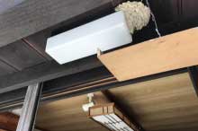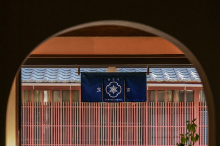 入口には丸型のレトロデザインの照明を。揺れる暖簾の美しさを一層引き立てています。