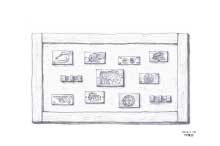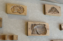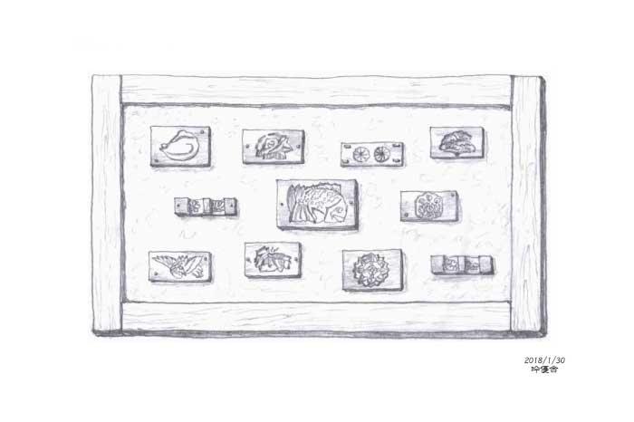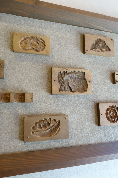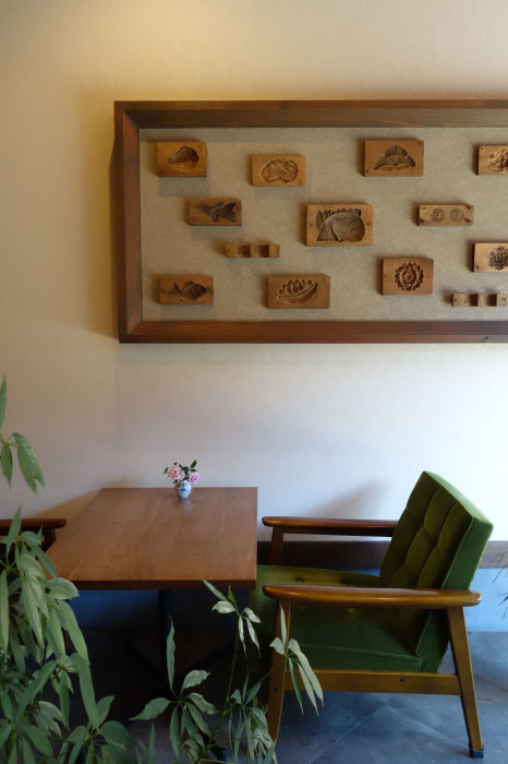 壁を彩る木製レリーフは、干菓子の型をもとに制作したもの。弊社代表が集めていた型と、京都の小道具屋で見つけた型を組み合わせ、額に収めて並べるデザインを考案し、大工が丁寧に仕上げました。