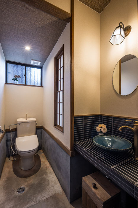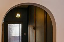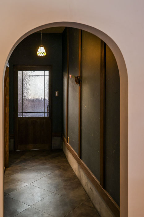 店内奥のトイレへの通路は、茶室の「火灯口(かとうぐち)」をイメージしたアーチ開口に設計。