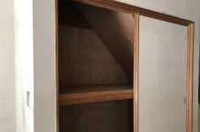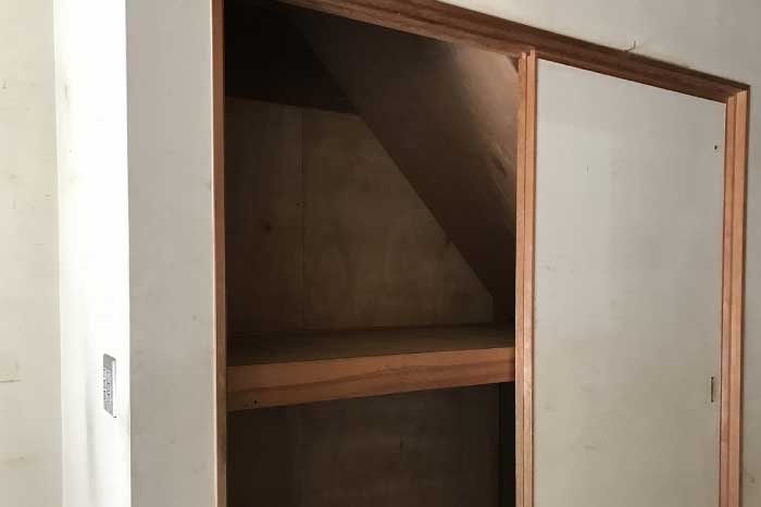 階段下の押し入れはオープンにし、壁紙を切り替えて華やぎを添えました。